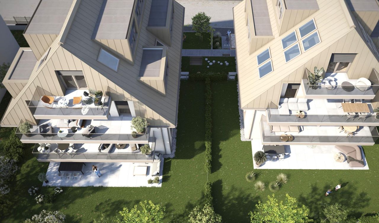 Jeder Wohnung verfügt über Freiflächen in Form von Terrassen und Eigengärten und Balkonen.