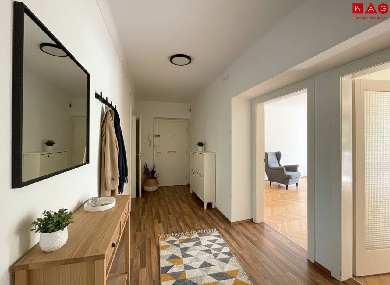 Die Wohnung liegt im 1. Stock ohne Lift. Vom Flur aus erreicht man das Wohnzimmer mit sonnigem Balkon sowie die beiden Schlafzimmer, Küche, (Extra-)WC und Abstellraum. Das Badezimmer verfügt sogar über ein eigenes Fenster. Alle Daten auf einem Blick: Wohnfläche ca. 72,02m² und 6,85m² Loggia/ Balkon • Flurbereich • 3...
