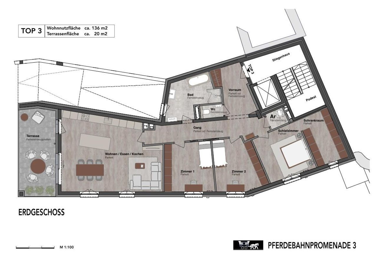 Die Wohnung Top 3 verfügt über eine Wohnfläche von ca. 136 m², welche sich barrierefrei auf ein Geschoss wie folgt aufteilt: