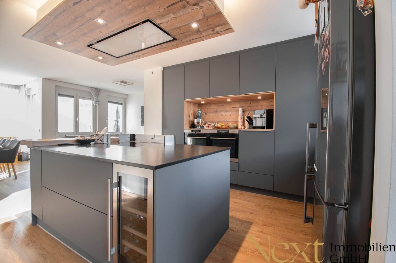 Bereits beim Betreten der unteren Ebene eröffnet sich ein einladender Wohn- und Essbereich, der durch seine Offenheit und die großen Fensterflächen mit Tageslicht durchflutet wird. Die hochwertig ausgestattete HAKA-Küche (inkl. AEG Geräte und Steinarbeitsplatte) fügt sich nahtlos in das moderne Gesamtbild ein und bildet gemeinsam mit dem Wohnbereich das Herzstück der Wohnung. Warme Holzelemente und stilvolle, dunkle Fronten schaffen dabei eine elegante und zugleich gemütliche Atmosphäre.