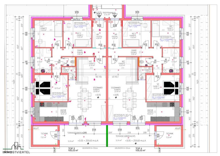 * Raumaufteilung: Vorraum, Bad, WC, AR, 3 Schlafzimmer, Gang, Wohn-Esszimmer mit angrenzender Küche, Loggia, Technikraum