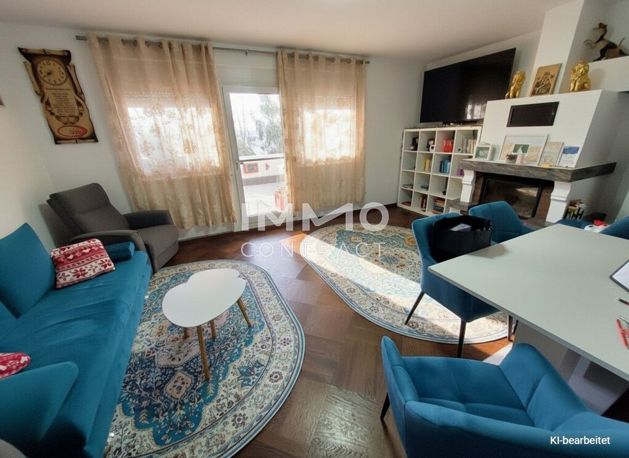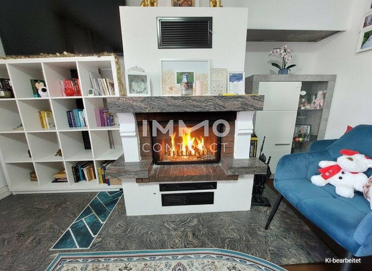 * Wohnzimmer mit Zugang zur großen Loggia, ein zentraler Kaminofen im Wohnzimmer sorgt für gemütliche Wärme