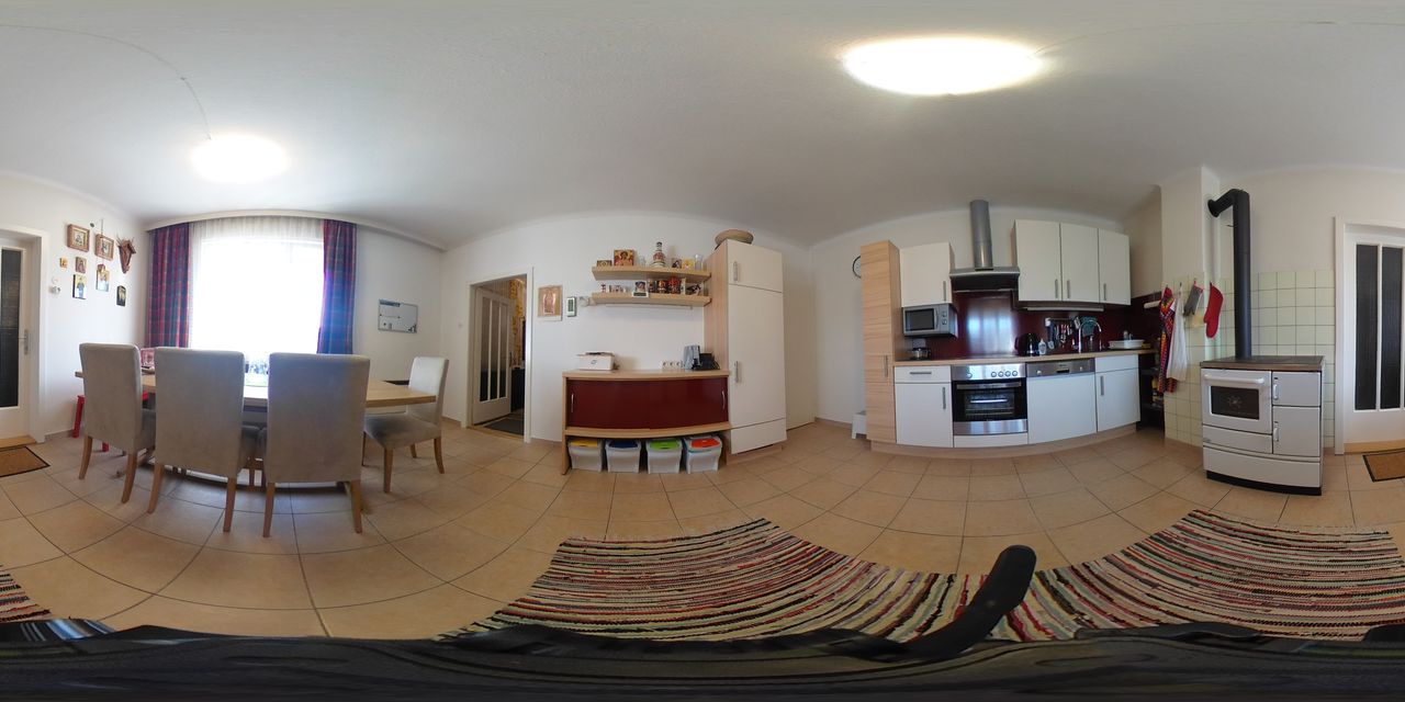 Die Beheizung erfolgt durch eine Elektroheizung und einen zusätzlichen Ofen mit festen Brennstoffen in der Küche.