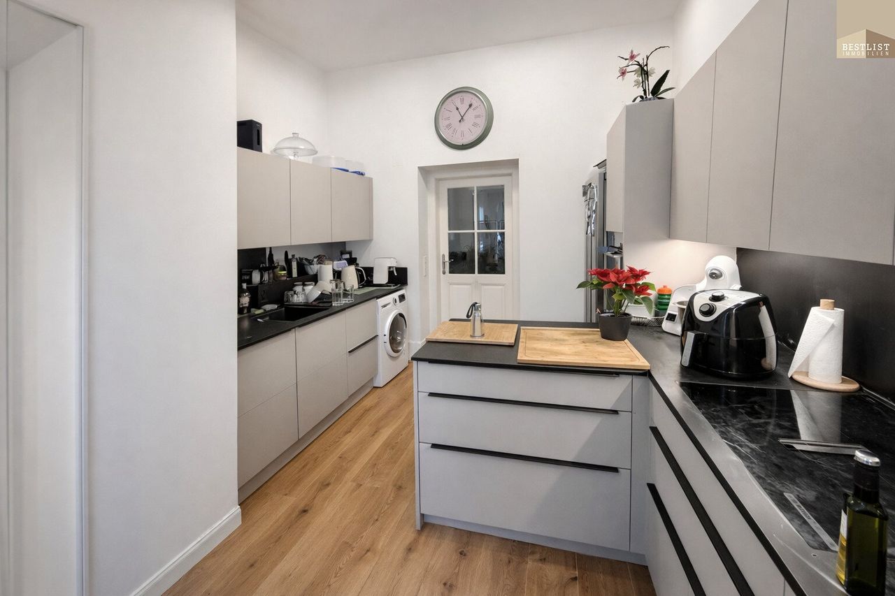 Die separate Küche ist funktional angeordnet und ist vollwertige ausgestattet. Das Kabinett eignet sich ideal als Arbeits-, Gäste- oder Kinderzimmer.
