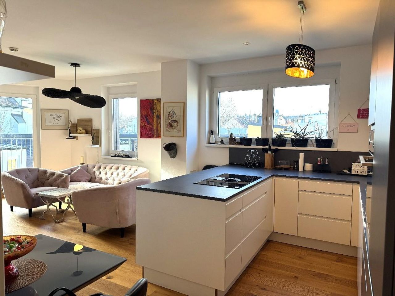 Vorraum ca.4,5m², Wohnküche ca. 31,5m² mit moderner, neuwertiger Einbauküche mit Kochinsel und Ausgang auf die ca. 16m² großer, westseitiger Dachterrasse mit toller Aussicht über Maria Enzersdorf,