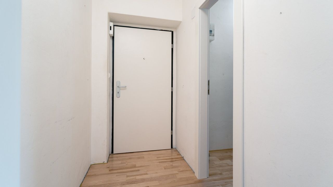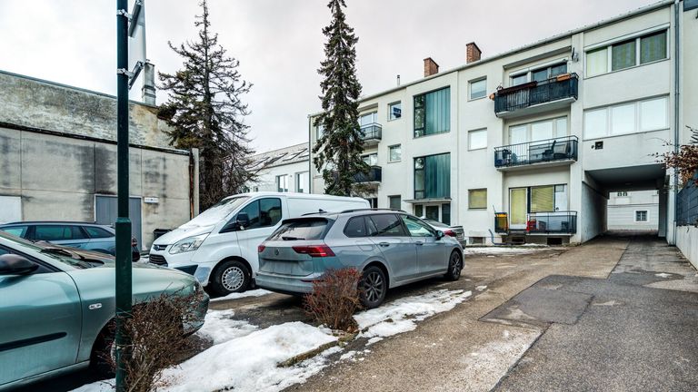 Über den gemeinschaftlich genutzten Parkplatz, auf dem Anwohner je nach Verfügbarkeit parken können, erreicht man das Stiegenhaus, von dem aus die Wohnung im zweiten Stock zugänglich ist. Der Eingangsbereich bietet Platz für eine Garderobe sowie einen zusätzlichen Abstellraum, der ebenfalls sehr viel Stauraum bietet.