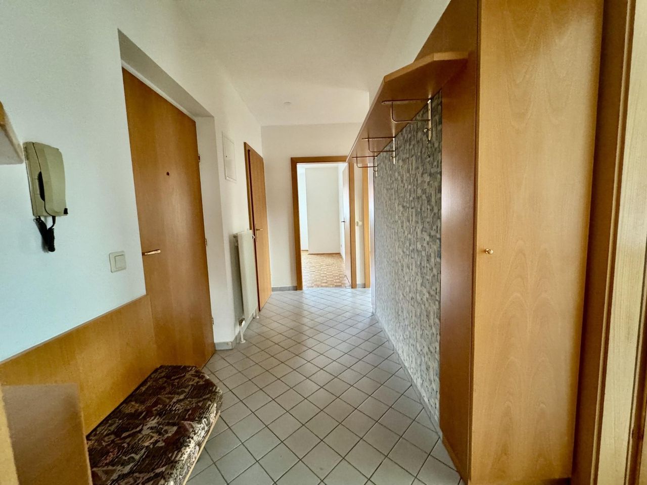 Beim Betreten der Wohnung gelangen Sie zunächst ins geräumige Vorrzimmer, von dem aus alle weiteren Räume zentral erreichbar sind: das erste und zweite Schlafzimmer, das Badezimmer, das separate WC, die Küche und der großzügige Wohnbereich.