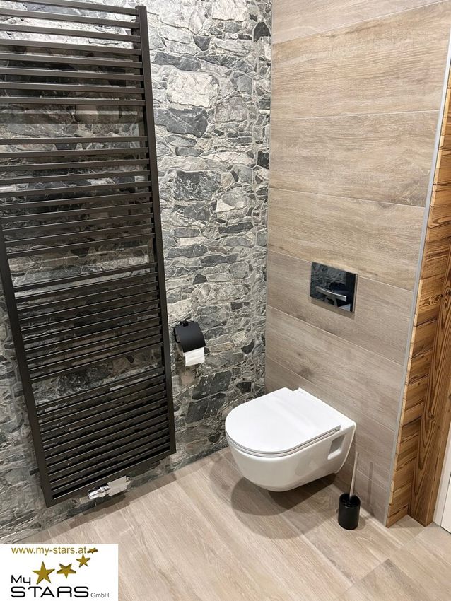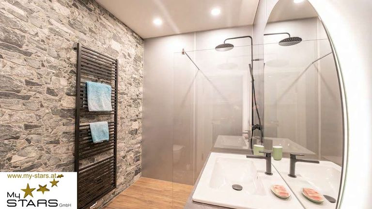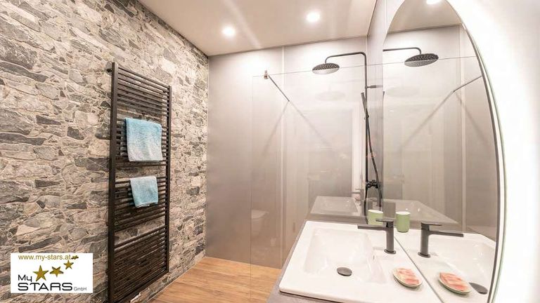 Im modernen Badezimmer mit Dusche und WC können Sie sich bei wunderbarem Ausblick