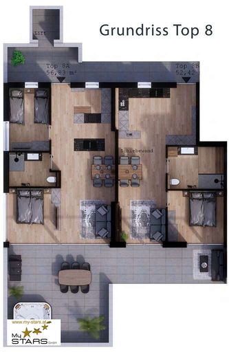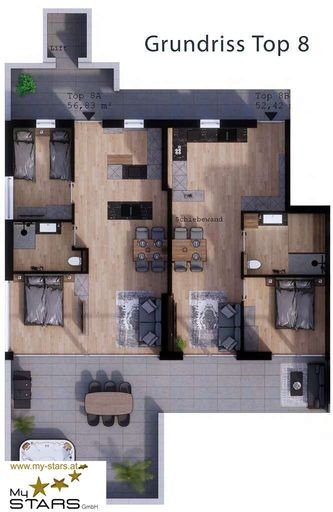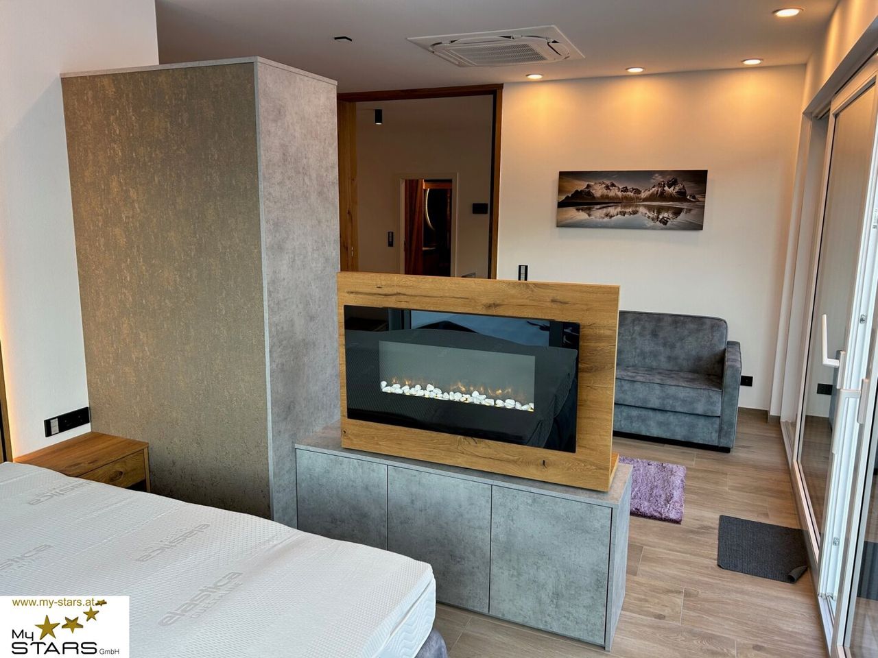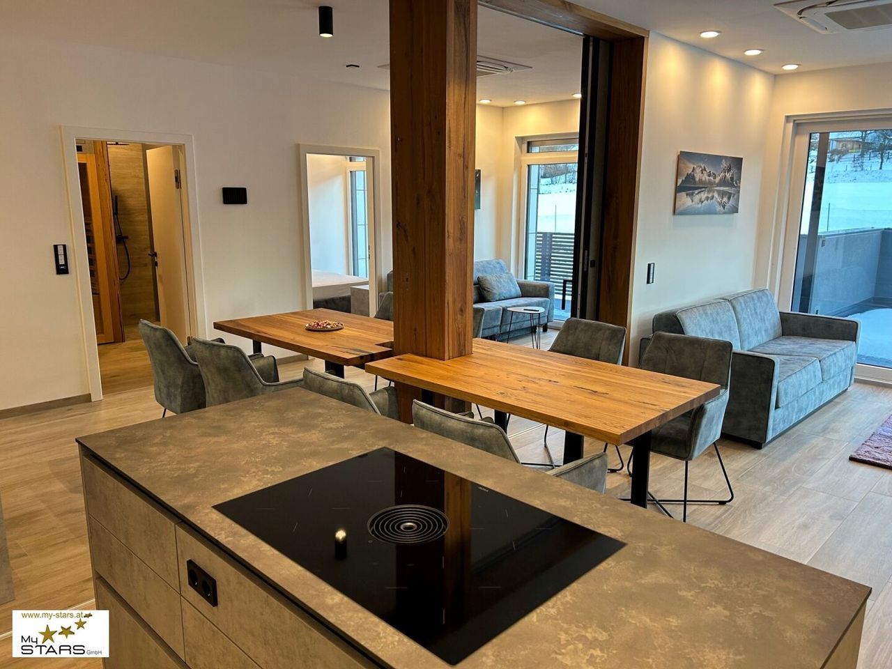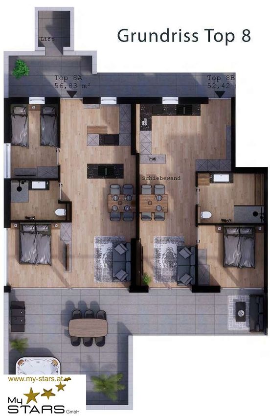 Durch die zwei getrennten Eingänge und der versperrbaren Schiebewand inmitten des Penthouses, sind in Sekunden zwei von einander unabhängige