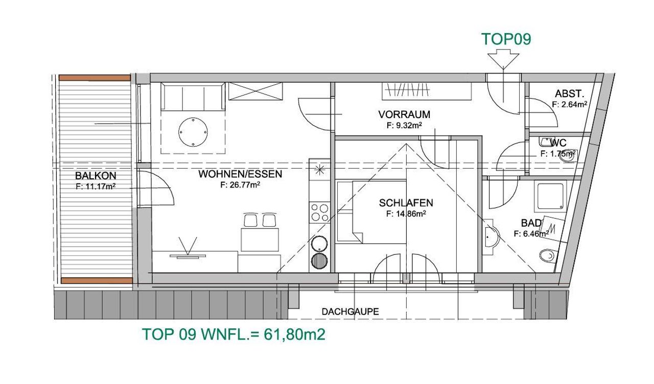 Vorraum mit Garderobe - WC - Stauraum - Badezimmer - Schlafzimmer - komfortables Wohn/Esszimmer mit Zugang auf Balkon - Kellerabteil.