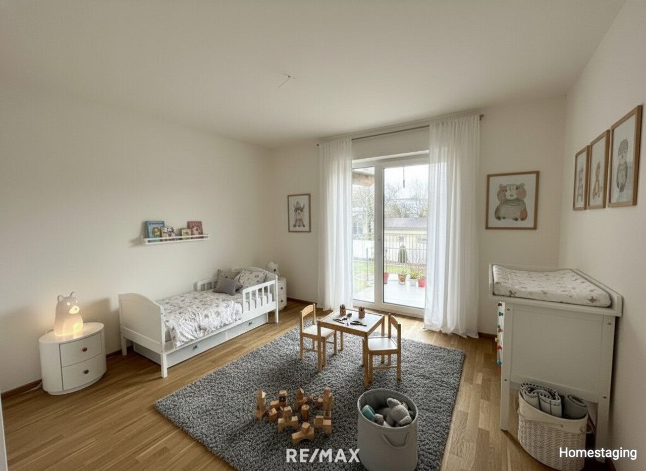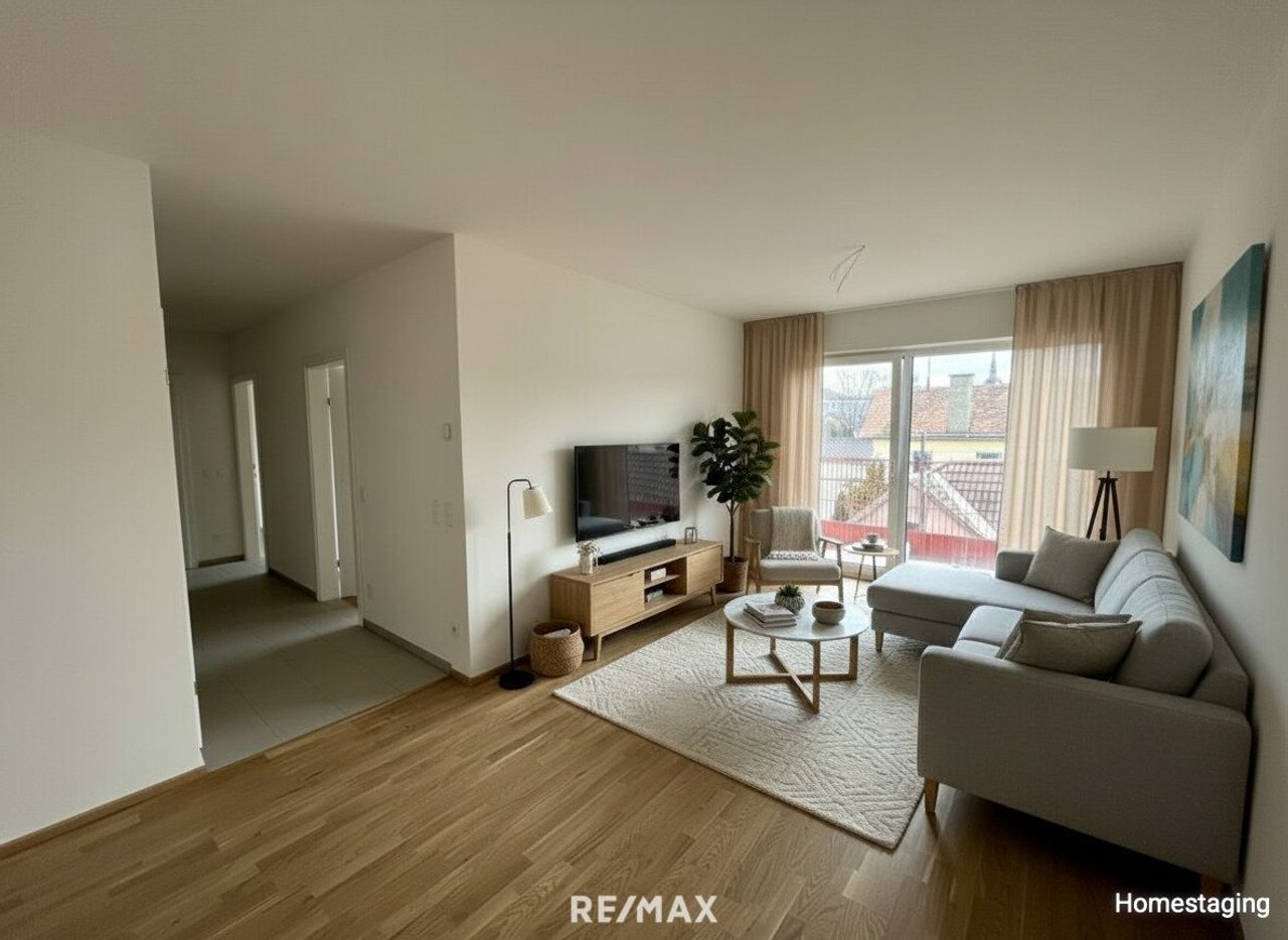 Die Raumaufteilung umfasst einen einladenden Vorraum, ein modernes Badezimmer, ein separates WC, einen praktischen Abstellraum, zwei helle Zimmer sowie eine großzügige Wohn-Essküche, die das Herzstück der Wohnung bildet und zum Wohlfühlen einlädt. Ein besonderes Highlight ist der großzügige Balkon, der sowohl von der Wohn-Essküche als auch von den beiden Zimmern aus direkt begehbar ist. Dadurch entsteht ein besonders offenes und lichtdurchflutetes Wohngefühl mit harmonischem Übergang zwischen Innen- und Außenbereich.