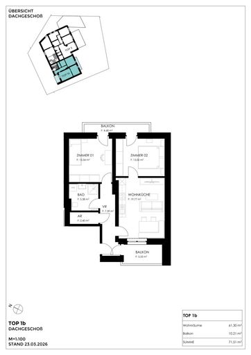Vorraum | Abstellraum | Bad mit WC | 2 Zimmer mit Balkonzugang (4,68 m²) | Wohnküche mit Balkonzugang (5,53 m²)