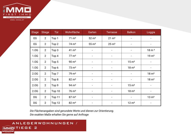 | Etage | Stiege | Tür | Wohnfläche | Garten | Terrasse | Balkon | Loggia |