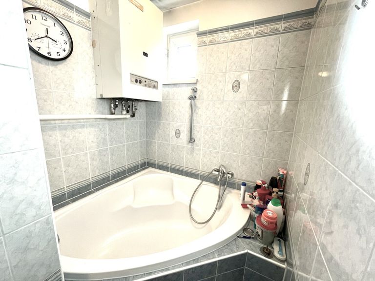 *Das Badezimmer: Vom Vorzimmer aus rechts liegt das Badezimmer mit der Eckbadewanne, dem Waschbecken und dem Fenster;