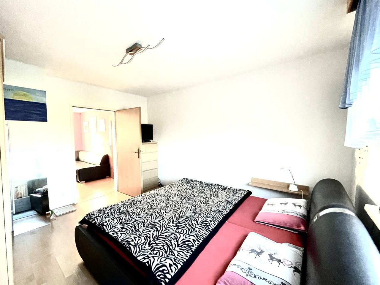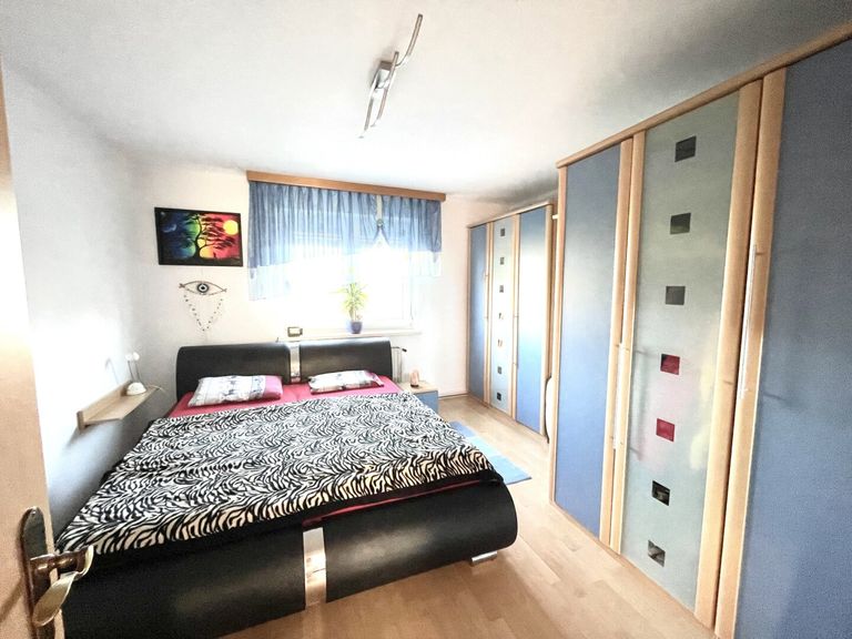 *Das erste Zimmer: Durch das Wohnzimmer kann man jeweils das erste und das zweite Zimmer betreten. Das erste große Zimmer wird derzeit als Hauptschlafzimmer bewohnt. Es bietet aufgrund seiner Größe neben einem Doppelbett auch ausreichend Platz für einen großen Kleiderschrank.