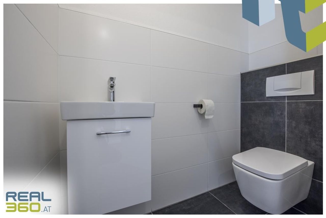 Das Schlafzimmer und die beiden Kinderzimmer haben eine optimale Größe für Ihre individuellen Einrichtungsideen. Das Badezimmer verfügt über großformatige anthrazitfarbene Fließen, eine Badewanne, eine große Dusche mit einer Glaswand, einen Handtuchheizkörper und einen Doppelwaschtisch. Ein Unterschrank sowie ein Hängeschrank sind bereits angebracht. Das separate WC ist ebenso mit einem Waschbecken ausgestattet.