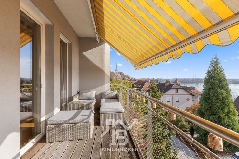 Und das Highlight: Die große überdachte Terrasse mit direktem Blick auf die Donau erweitert den Wohnraum nach draußen und lädt zu entspannten Stunden mit Sonne, frischer Luft und traumhafter Aussicht ein.