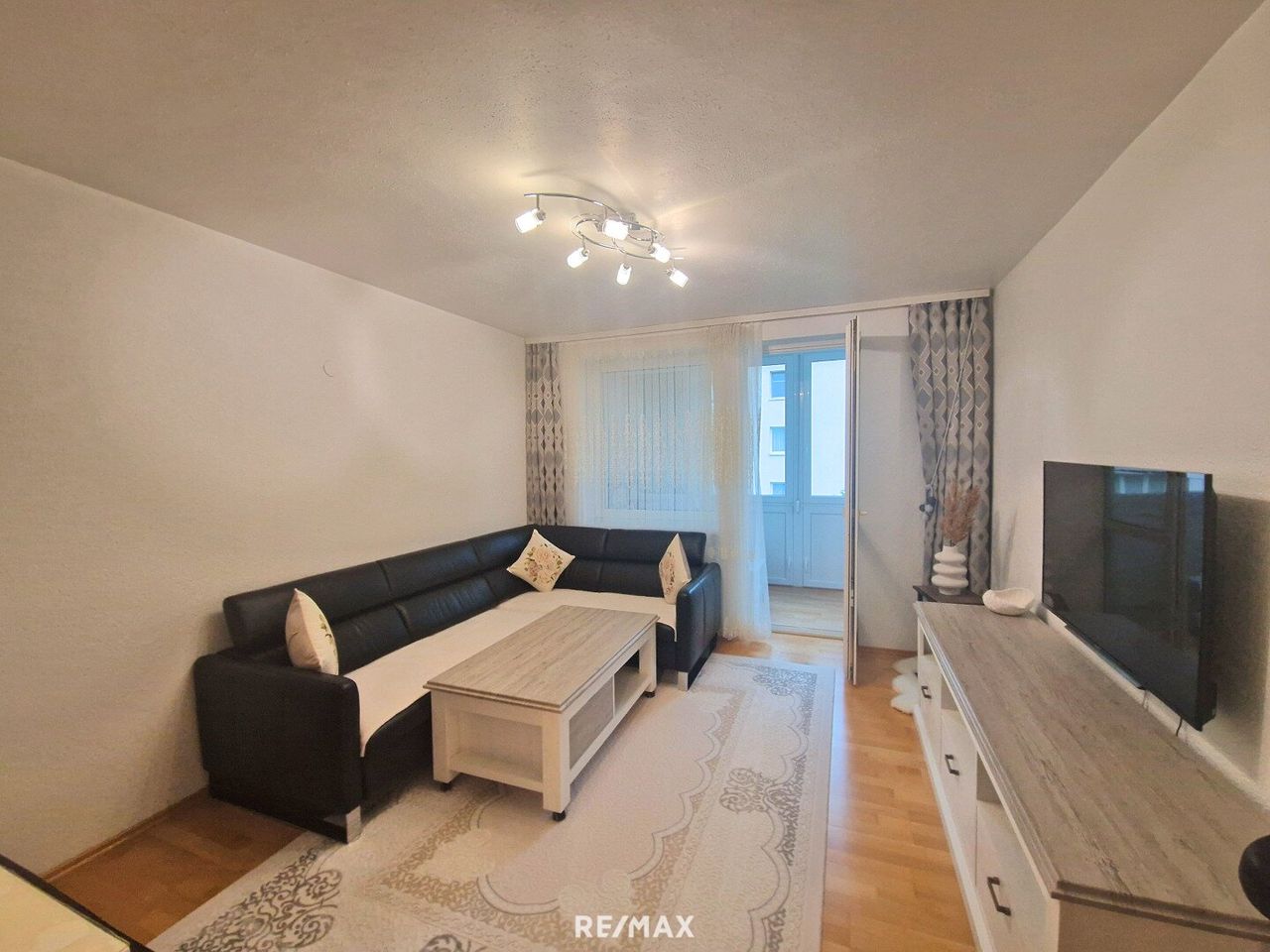 Ein lichtdurchflutetes Wohnzimmer mit Zugang zur verglasten Loggia – der perfekte Ort zum Entspannen zu jeder Jahreszeit!
