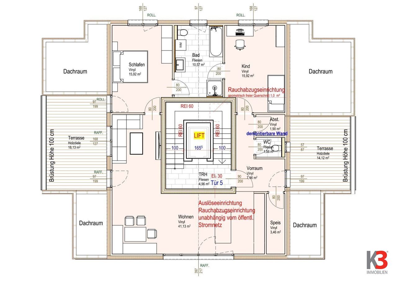 Diese Wohnung ist die einzige im Dachgeschoss, wird bequem mit dem Lift erreicht und bietet neben einer großzügigen Wohnfläche noch zwei Dachterrassen, eine nach Osten und eine nach Westen ausgerichtet.