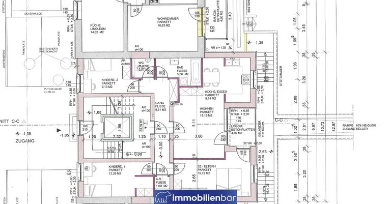 4 Zimmer (3 Schlafzimmer, Wohnzimmer und Küche, Loggia, Abstellraum und Bad, WC)