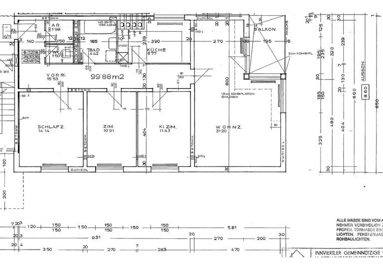 - Raumaufteilung: Vorraum, Bad, WC, Abstellraum, möblierte Küche, Wohn-/Esszimmer mit Ausgang auf den Balkon, drei Schlafzimmer