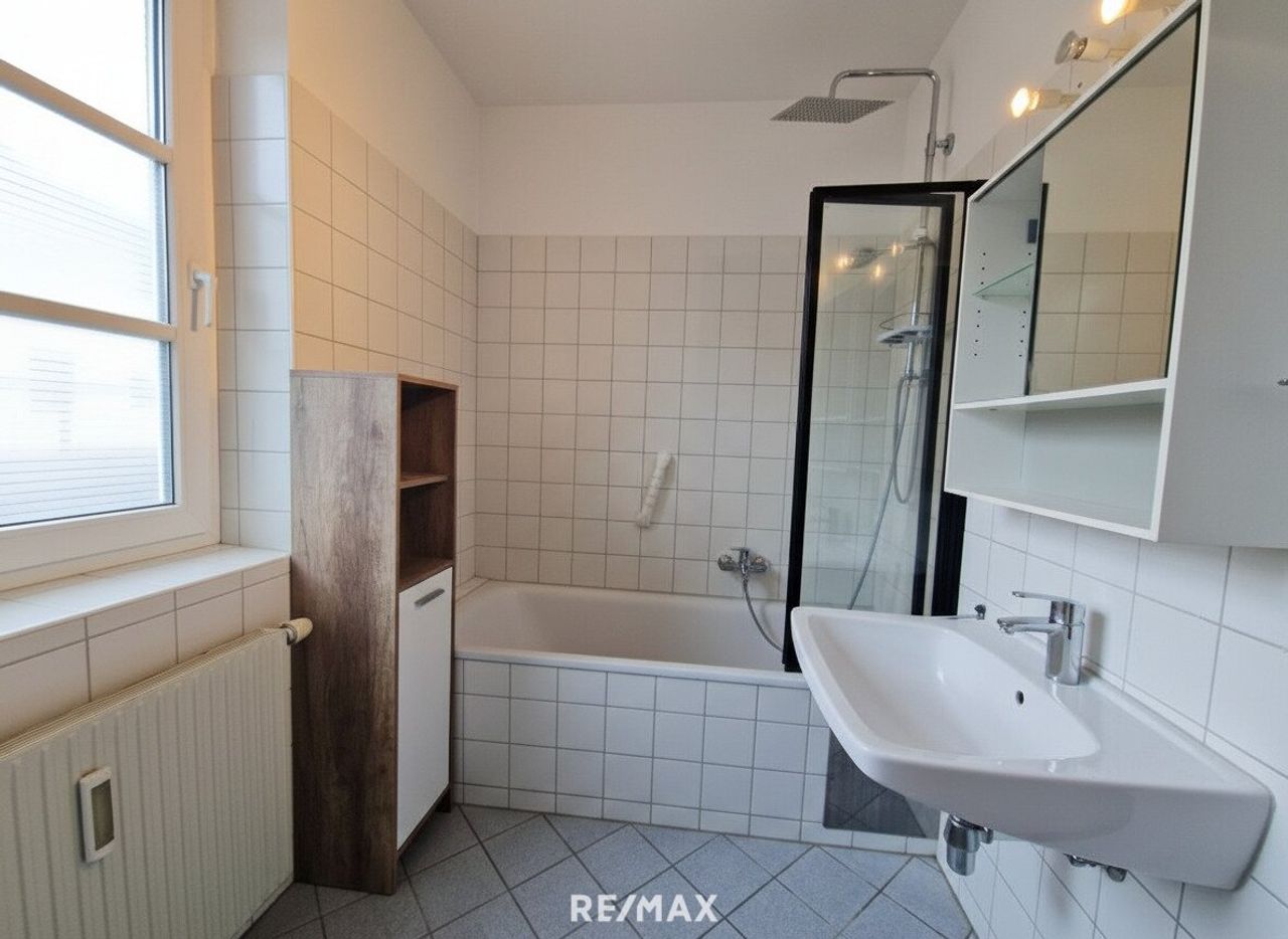 Die Wohnung verfügt über ein separates Schlafzimmer, ein großzügiges Wohn-Esszimmer, eine eigene Küche, ein Badezimmer mit Badewanne sowie ein getrenntes WC. Ein praktischer Abstellraum bietet zusätzlichen Stauraum.