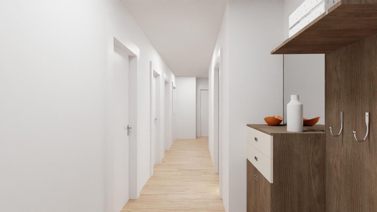 Vom Carport aus gelangen Sie über eine private überdachte Stiege zur Eingangstür Ihrer Wohnung. Über diese kommen Sie dann direkt in den großzügigen Eingangsbereich. Hier haben Sie ausreichend Platz für eine große Garderobe, um Ihre Gäste bestens empfangen zu können. Die einzelnen Räume sind vom Gang aus zugänglich. Das Badezimmer verfügt über eine Badewanne für entspannte Wellness-Momente sowie eine separate, moderne Dusche für den schnellen Start in den Tag. Zusätzlich zur exklusiven Badausstattung gibt es ein separates WC für mehr Komfort und Privatsphäre. Der Abstellraum verschafft Ihnen weiteren Platz, um unterschiedliche Dinge verstauen oder lagern zu können.