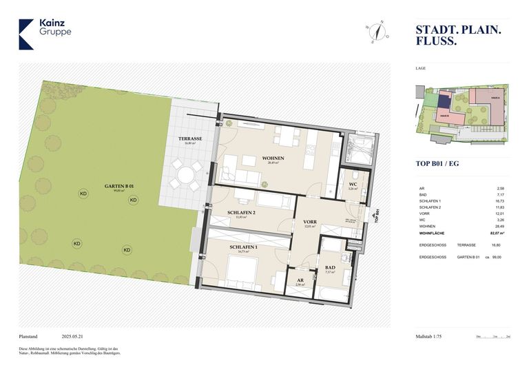 Die Mozartstadt wird um ein spannendes Wohnobjekt reicher: In der Plainstraße, am Josef-Mayburger-Kai entsteht das STADT. PLAIN. FLUSS. Ein Lebensraum für Menschen, die (noch) mehr vom Stadtleben wollen. 32 Wohnungen, ein Penthouse, zwei Häuser – unten durch einen Supermarkt, oben durch einen gemeinsamen Dachgarten verbunden. In Salzburgs vielseitigem Norden, mit idealer Anbindung, der Salzach und all den Vorzügen des Stadtlebens in der direkten Umgebung. Für ein modernes, stadtnahes und gleichzeitig herrlich grünes Leben in Salzburg.