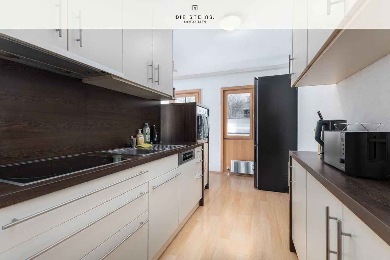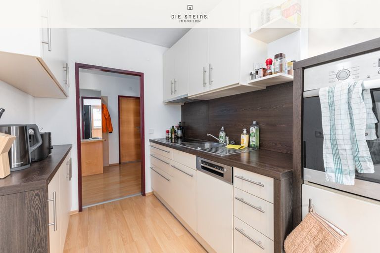 Die Wohnung im 1. Stock überzeugt durch eine durchdachte Raumaufteilung und einen gepflegten Zustand. Die moderne Einbauküche lädt zum Kochen ein, während der helle Wohnbereich mit Parkettboden eine angenehme Atmosphäre schafft.