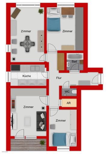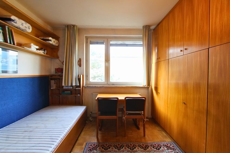 Der Grundriss ist durchdacht und bietet zahlreiche Möglichkeiten: Ein heller Wohnbereich mit Zugang zur Loggia, drei weitere Zimmer, eine separate Küche mit Einbauküche, ein Badezimmer mit Badewanne, ein separates WC sowie ein Abstellraum. Der bestehende Parkettboden verleiht den Räumen eine angenehme Atmosphäre, während die Fernwärme für behagliche Wärme sorgt.