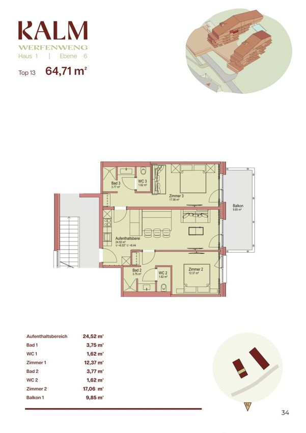 Zum Verkauf steht ein attraktives 3-Zimmer-Ferienapartment mit einer Wohnfläche von ca. 64,7 m², situiert in einem exklusiven Resort direkt an der Talstation der Rosnerköpflbahn in Werfenweng.
