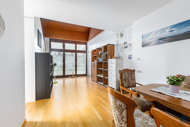 Im oberen Bereich erstreckt sich die Maisonette-Wohnung (7-Zimmer-Wohnung) über das Ober- bzw. Dachgeschoss und besticht durch eine Gesamt-Fläche von ca. 215,82 m² und großzügiger Raumeinteilung. Der untere Wohnbereich (1. Obergeschoss) der Maisonette-Wohnung verfügt über eine Größe von 142,02 m². Hier befinden sich die 3 Wohn-Schlafräume, das Badezimmer, Küche samt Wirtschaftraum en suite und ein großer Wohnraum mit Treppenaufgang ins Dachgeschoss. Das Badezimmer ist mit zeitgemäßen Fliesen versehen und verfügt über eine große ebenerdige Dusche sowie eine Badewanne und eine Toilette. Weiters gibt es noch eine Gäste-Toilette. Die zeitlos, moderne Einbauküche ist nicht nur funktional, sondern auch das Herzstück jeder geselligen Zusammenkunft und ist sowohl an den Essbereich bzw. direkt an den abgetrennten Wirtschaftsraum (mit WM-Anschluss) angeschlossen. Die Böden sind mit Holz-/Parkett- sowie Vinyl- bzw. Fliesenbelägen versehen. Über die Treppe gelangt man ins ausgebaute Dachgeschoss mit ca. 73,80 m². Hier befindet sich ein zusätzlicher Wohnraum mit Ausgang auf die sonnige Terrasse mit ca. 17,15 m² und ein Schlafzimmer/ Büro. Individuell nutzbar ist der große Dachraum/ Studio (mit ca. 31 m²). Der obere Wohnbereich ist mit Holzdecken und Teppichböden ausgestattet.