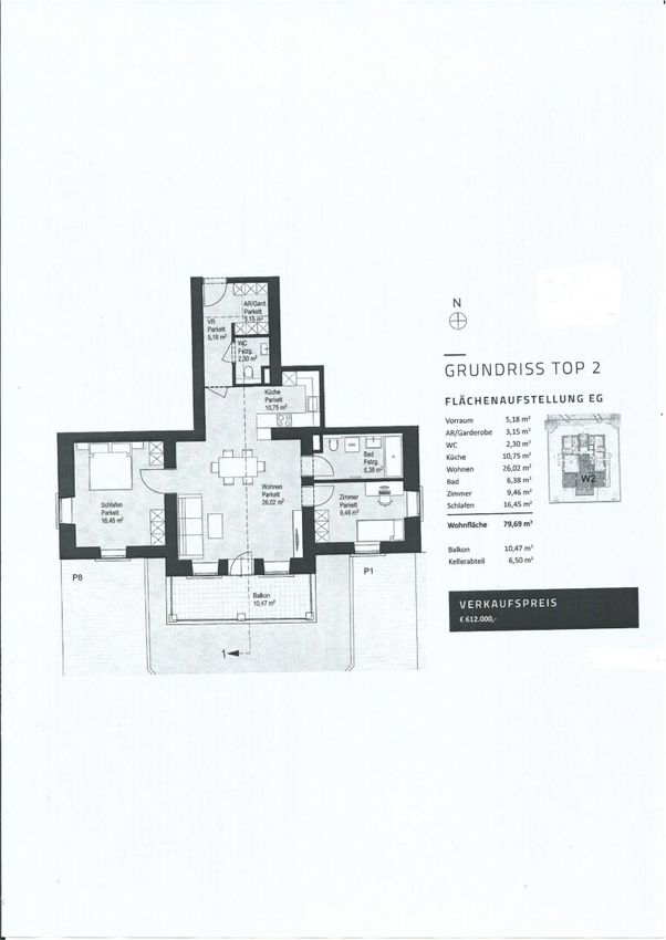 Diese 3-Zimmerwohnung liegt Hochparterre. Die ca. 80 m2 Wohnfläche sind wohldurchdacht angelegt und haben mit zwei Schlafzimmern, Bad, WC, Garderobe, Vorraum sowie dem ca. 26 m2 großen Wohn/Ess/Kochbereich alles im Programm, was gutes Wohnen ausmacht. Große Fenster sorgen für eine natürliche und angenehme Wohnatmosphäre. Und wer eine Auszeit unter freiem Himmel genießen möchte, kann sich auf dem eigenen Balkon entspannt zurücklehnen. Zum Wohnpaket gehören auch Kellerabteil und Freistellplatz. Die Kosten pro Stellplatz betragen € 20.000,-. Dieses innovative Wohnkonzept überzeugt auf ganzer Linie mit perfekter Raumaufteilung und hohem Wohnkomfort.