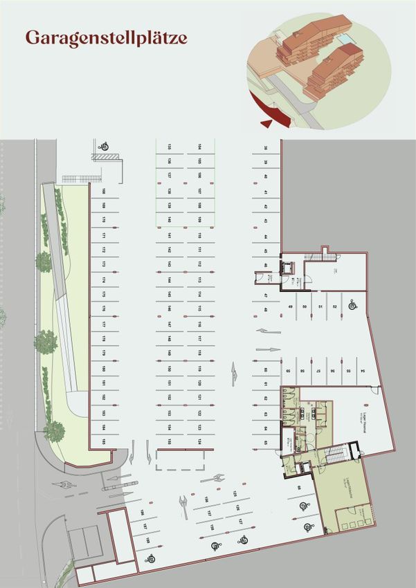 Zusätzlich besteht die Möglichkeit zum käuflichen Erwerb eines Pkw-Stellplatzes. Insgesamt stehen 49 Pkw-Stellplätze für das gesamte Projekt zur Verfügung.