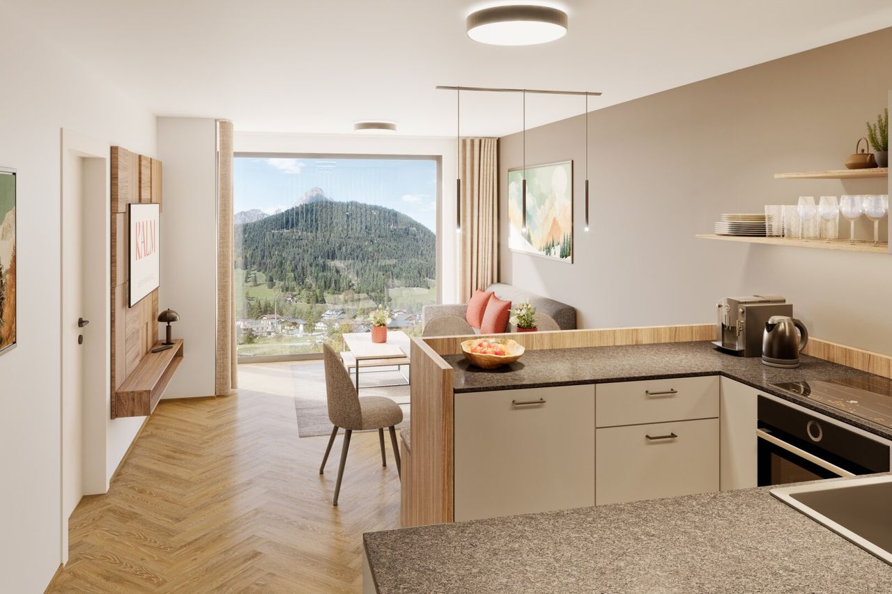 Die Einheit wird vollständig möbliert inklusive hochwertiger Küche übergeben. Das Einrichtungskonzept ist modern, zeitlos und optimal auf die ganzjährige touristische Nutzung abgestimmt.