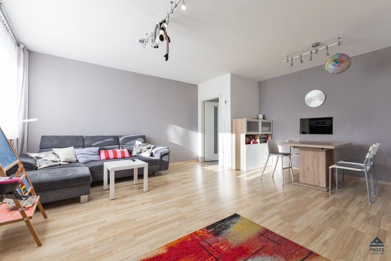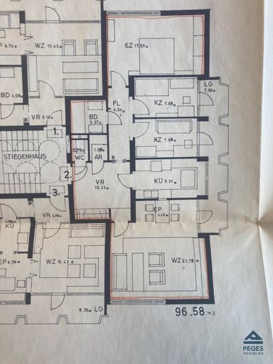 Räumliche Einteilung: Vorraum, WC separat, Abstellraum (mit WM-Anschluss), Zwischenflur, Bad (mit Badwanne), Schlafzimmer, 2 Kinderzimmer, Küche eingerichtet, Wohn-Esszimmer, Balkon; Kellerabteil, Parkplatz