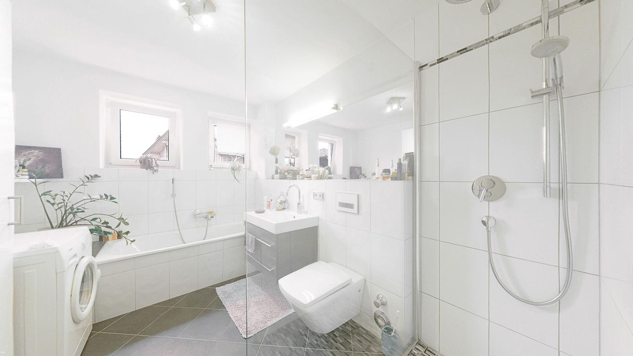 Das Badezimmer überzeugt mit einer stilvollen Gestaltung in zeitlosen Farbtönen. Ausgestattet ist es mit einem Waschtisch, einer großzügigen Dusche, WC und einem Waschmaschinenanschluss.