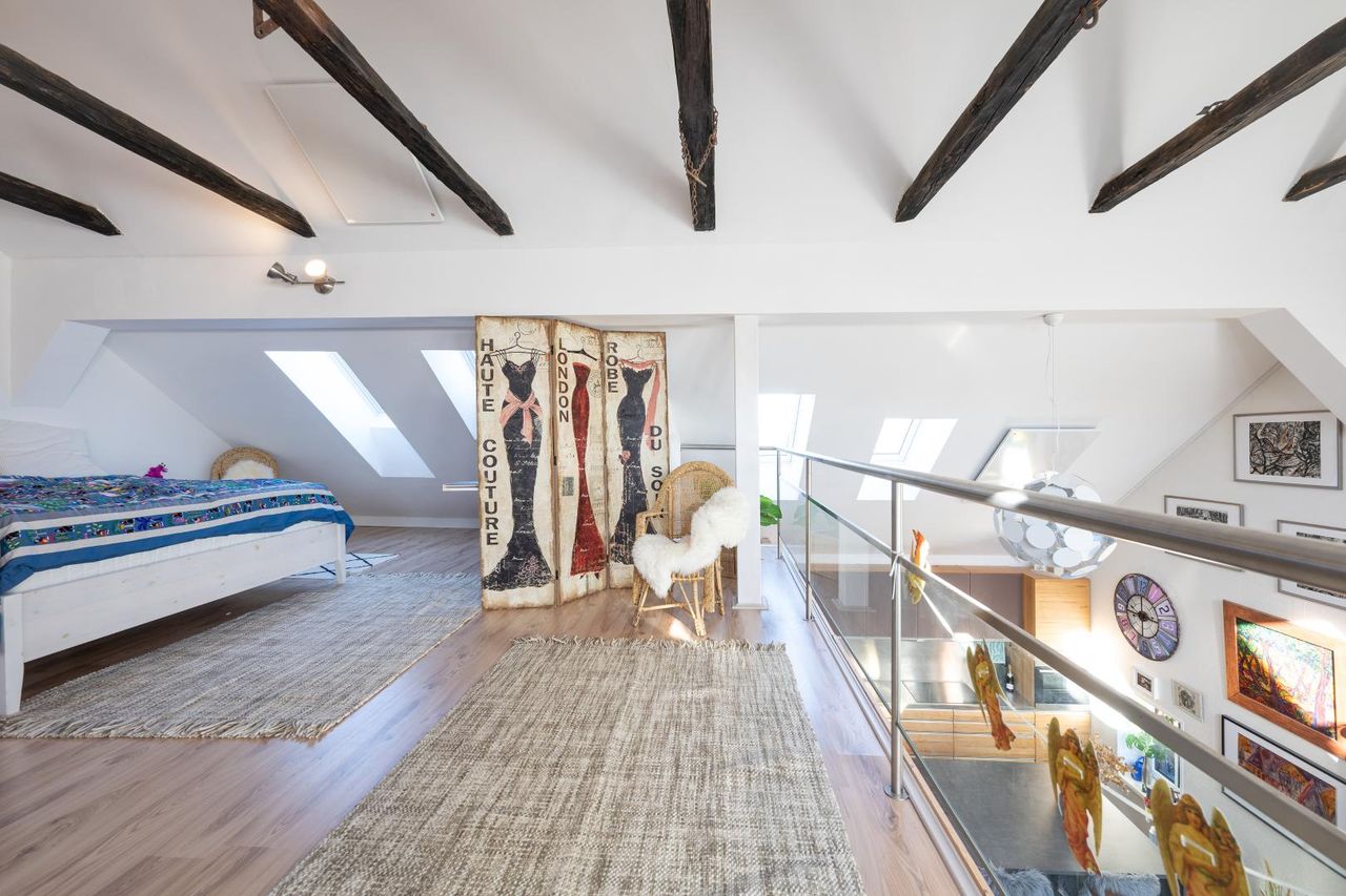 Die offene Galerie mit originalem Dachstuhl bringt Struktur, Weitblick und Atmosphäre – ein Raum, der nicht nur beeindruckt, sondern funktioniert.