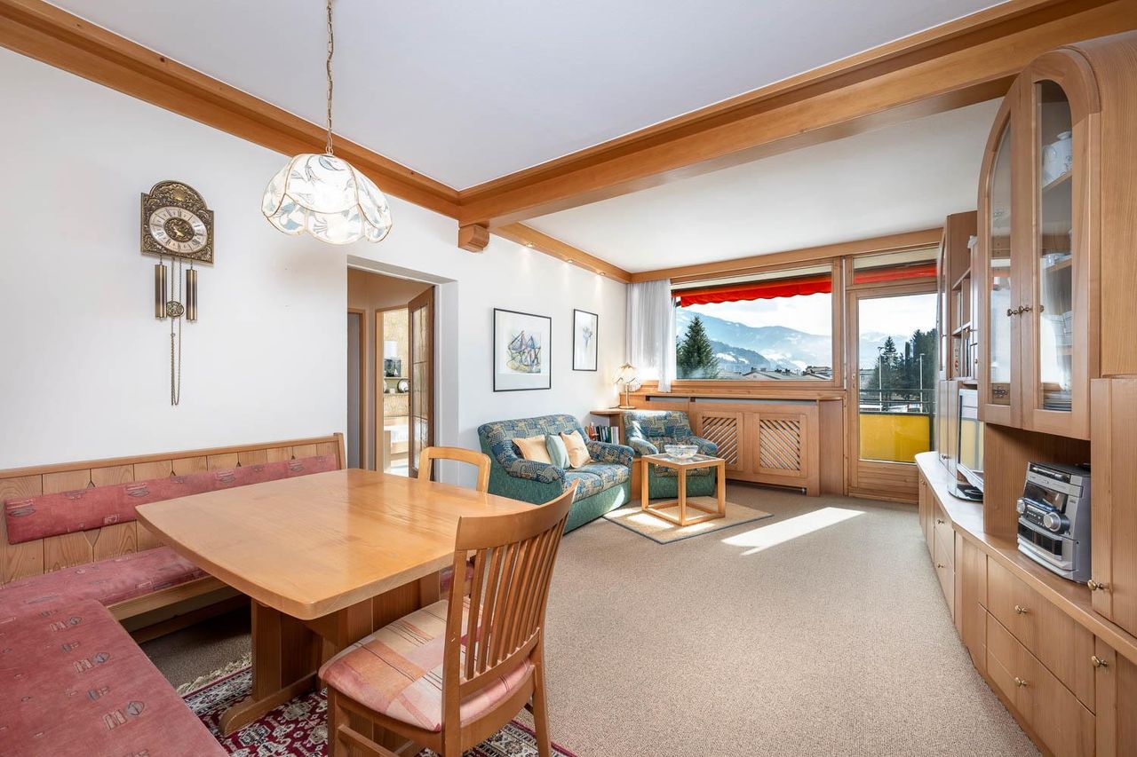 Das Herzstück der Wohnung bildet das großzügige Wohnzimmer mit direktem Zugang zum südseitigen Balkon. Hier genießen Sie viele Sonnenstunden sowie einen herrlichen Blick auf die Umgebung – ein perfekter Ort zum Entspannen.