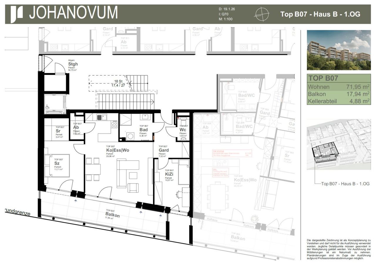 JohaNovum – Wohnung B07 | ca. 71,95 m² Diese durchdacht geschnittene 3-Zimmer-Wohnung im 1. Obergeschoss überzeugt mit einem großzügigen Wohn-/Essbereich samt offener Küche und direktem Zugang auf den rund 17,94 m² großen Balkon. Zwei gut proportionierte Schlafzimmer, eine geräumige Garderobe, ein separates WC sowie ein zusätzlicher Abstellraum sorgen für hohen Wohnkomfort und optimale Alltagstauglichkeit. Die klare Raumstruktur und die angenehme Belichtung schaffen eine moderne, freundliche Wohnatmosphäre. Garagenstellplätze sind zum Preis von € 33.500 pro Stellplatz verfügbar und nicht im angegebenen Kaufpreis der Wohnung enthalten. Sie suchen etwas ganz Bestimmtes? Auf Anfrage übermitteln wir Ihnen gerne weitere verfügbare Einheiten im JohaNovum....