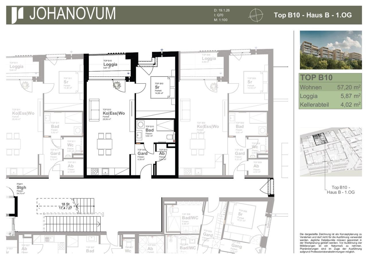 JohaNovum – Wohnung B10 | ca. 57,20 m² Diese kompakt und effizient geschnittene 2-Zimmer-Wohnung im 1. Obergeschoss bietet einen rund 28,59 m² großen Wohn-/Essbereich mit direktem Zugang zur ca. 5,87 m² großen Loggia. Das gut proportionierte Schlafzimmer, ein modernes Badezimmer sowie eine praktische Garderobe und ein zusätzlicher Abstellraum sorgen für durchdachten Wohnkomfort. Die klare Raumstruktur und die angenehme Belichtung schaffen eine zeitgemäße Wohnatmosphäre – ideal für Singles, Paare oder als attraktive Anlageimmobilie. Garagenstellplätze sind zum Preis von € 33.500 pro Stellplatz verfügbar und nicht im angegebenen Kaufpreis der Wohnung enthalten. Sie suchen etwas ganz Bestimmtes? Auf Anfrage übermitteln wir Ihnen...