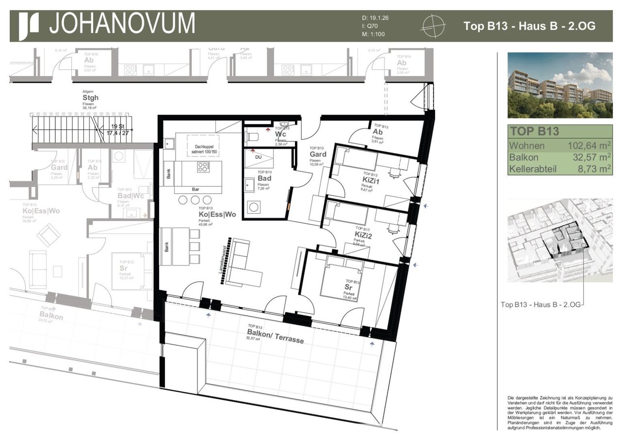 JohaNovum – Wohnung B13 | ca. 102,64 m² Diese großzügige 4-Zimmer-Wohnung im 2. Obergeschoss überzeugt mit einem beeindruckenden Wohn-/Essbereich von rund 45,98 m² und direktem Zugang zur ca. 32,57 m² großen Balkon-/Terrassenfläche. Drei gut geschnittene Schlafzimmer bieten ausreichend Raum für Familie, Homeoffice oder Gäste. Ein modernes Badezimmer, ein separates WC, eine geräumige Garderobe sowie ein zusätzlicher Abstellraum sorgen für hohen Wohnkomfort und optimale Alltagstauglichkeit. Die Kombination aus großzügiger Wohnfläche und außergewöhnlichem Außenbereich macht diese Einheit zu einem besonderen Highlight im JohaNovum. Garagenstellplätze sind zum Preis von € 33.500 pro Stellplatz verfügbar und nicht im angegebenen Kaufpreis der Wohnung enthalten. Sie...