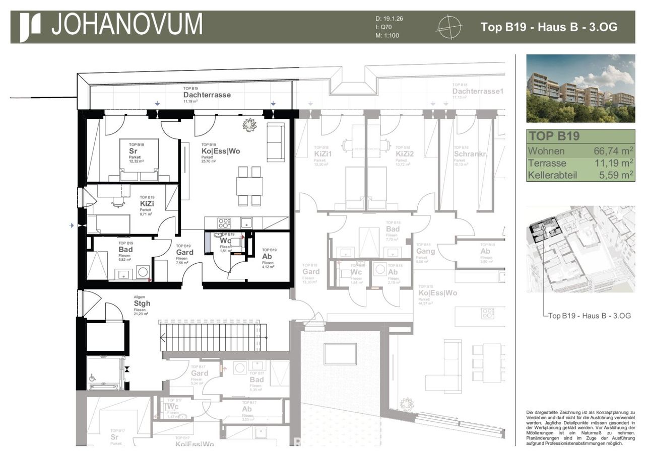 JohaNovum – Wohnung B19 | ca. 66,74 m² Diese attraktive 3-Zimmer-Wohnung im 3. Obergeschoss bietet eine durchdachte Raumaufteilung und eine ca. 11,19 m² große Dachterrasse mit angenehmem Außenraum. Der Wohn-/Essbereich mit rund 25,70 m² bildet das Zentrum der Wohnung und öffnet sich zur Terrasse. Ein komfortables Schlafzimmer sowie ein weiteres Zimmer, ideal als Kinder-, Gäste- oder Arbeitszimmer, schaffen flexible Nutzungsmöglichkeiten. Ein modernes Badezimmer, ein separates WC, eine geräumige Garderobe und ein zusätzlicher Abstellraum sorgen für hohen Wohnkomfort und Alltagstauglichkeit. Sie suchen etwas ganz Bestimmtes? Auf Anfrage übermitteln wir Ihnen gerne weitere verfügbare Einheiten im JohaNovum. Garagenstellplätze sind zum Preis von...