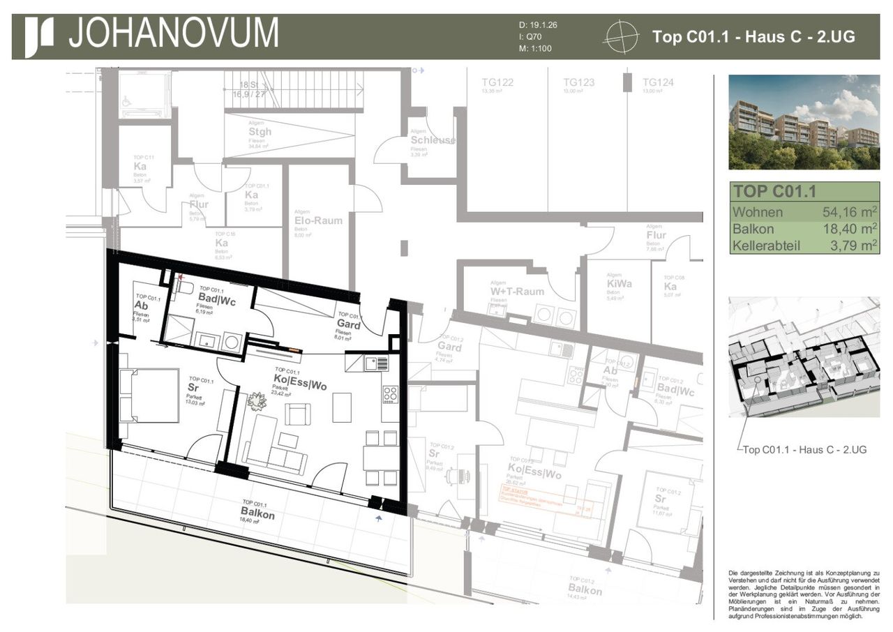 JohaNovum – Wohnung C01.1 | ca. 54,16 m² Diese gut geschnittene 2-Zimmer-Wohnung überzeugt mit einem durchdachten Grundriss und einem großzügigen Balkon mit rund 18,40 m². Der Wohn-/Essbereich mit ca. 23,42 m² bildet das Herzstück der Wohnung und bietet direkten Zugang ins Freie. Das komfortable Schlafzimmer, ein modernes Bad/WC sowie eine geräumige Garderobe und ein zusätzlicher Abstellraum sorgen für hohe Alltagstauglichkeit. Die Kombination aus kompakter Wohnfläche und großzügigem Außenbereich macht diese Einheit sowohl für Eigennutzer als auch für Anleger besonders attraktiv. Garagenstellplätze sind zum Preis von € 33.500 pro Stellplatz verfügbar und nicht im angegebenen Kaufpreis der Wohnung enthalten. Sie suchen...