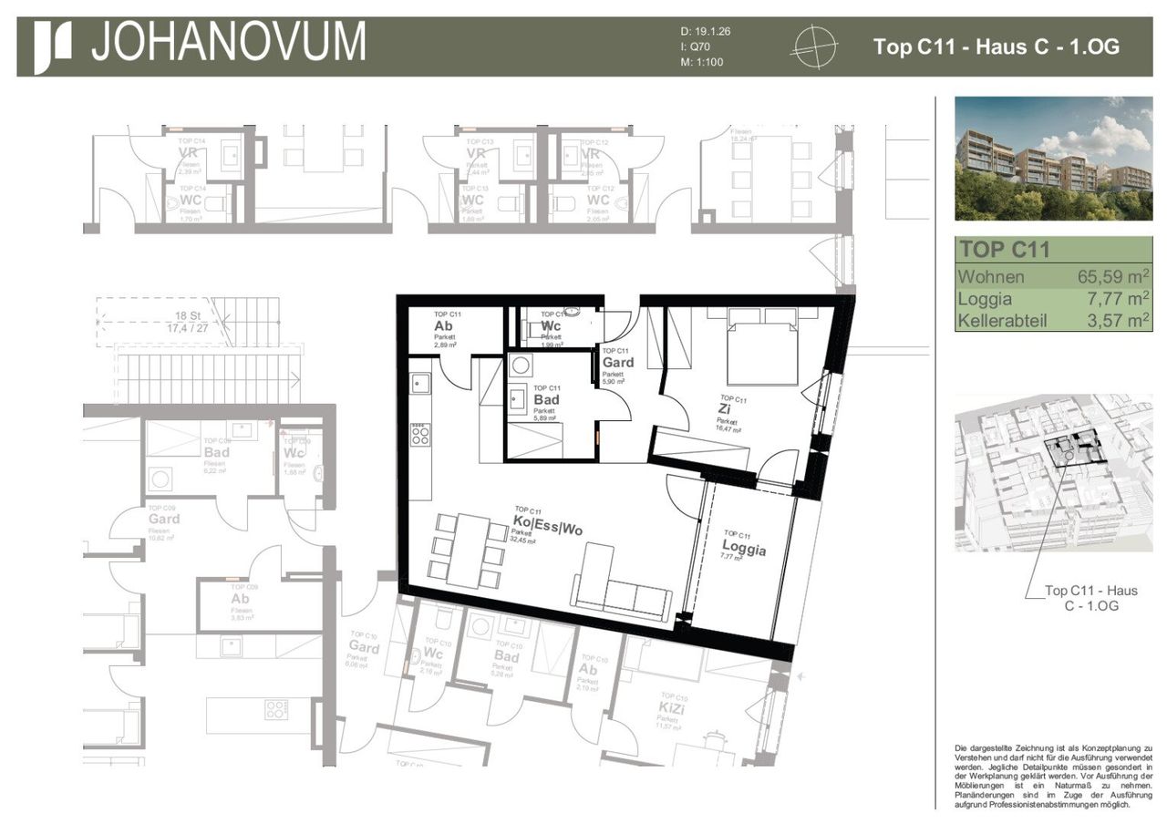 JohaNovum – Wohnung C11 | ca. 65,59 m² Diese gut proportionierte 2-Zimmer-Wohnung überzeugt mit einem großzügigen Wohn-/Essbereich von rund 32,45 m² und direktem Zugang zur ca. 7,77 m² großen Loggia. Das komfortable Schlafzimmer mit ca. 16,47 m² bietet viel Raum für individuelle Gestaltung. Ein modernes Badezimmer, ein separates WC, eine praktische Garderobe sowie ein zusätzlicher Abstellraum sorgen für hohen Wohnkomfort und Alltagstauglichkeit. Die durchdachte Raumaufteilung und der helle Wohnbereich machen diese Einheit besonders attraktiv – sowohl für Eigennutzer als auch für Anleger. Garagenstellplätze sind zum Preis von € 33.500 pro Stellplatz verfügbar und nicht im angegebenen Kaufpreis der Wohnung enthalten....