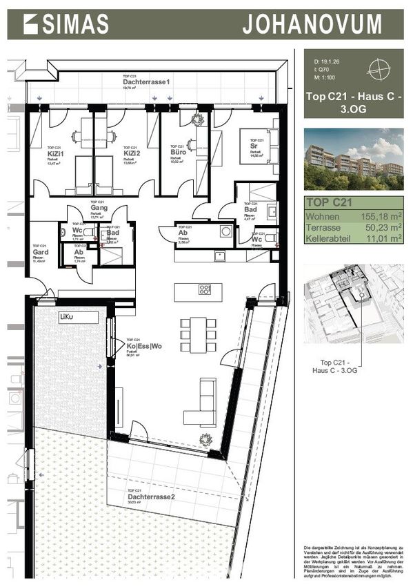 JohaNovum – Wohnung C21 | ca. 155,18 m² Diese exklusive 5-Zimmer-Penthousewohnung bietet rund 155,18 m² Wohnfläche und beeindruckende 50,23 m² Dachterrassenfläche. Der außergewöhnlich großzügige Wohn-/Essbereich mit ca. 60,91 m² bildet das Herzstück der Wohnung und öffnet sich zu den weitläufigen Außenbereichen. Drei komfortable Schlafzimmer sowie ein zusätzliches Büro bieten vielseitige Nutzungsmöglichkeiten für Familie, Homeoffice oder Gäste. Zwei moderne Badezimmer, zwei separate WCs, großzügige Garderoben- und Abstellflächen sorgen für höchsten Wohnkomfort. Diese Einheit vereint Großzügigkeit, Privatsphäre und repräsentative Außenflächen – ein absolutes Premium-Highlight im JohaNovum. Garagenstellplätze sind zum Preis von € 33.500 pro Stellplatz verfügbar und nicht im angegebenen Kaufpreis der...