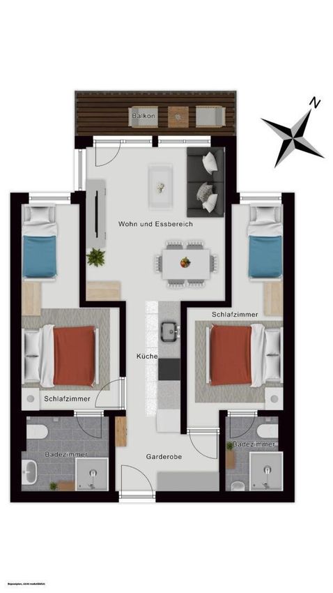 Die Wohnung überzeugt mit einer klar strukturierten und funktionalen Aufteilung: Vom Eingangsbereich mit Garderobe gelangen Sie in den offenen Wohn- und Essbereich, der gemeinsam mit der integrierten Küche das Herzstück der Einheit bildet. Von hier aus besteht Zugang zum Balkon, der zusätzlichen Freiraum bietet. Zwei getrennte Schlafzimmer ermöglichen eine komfortable Nutzung für Familie und Gäste. Besonders praktisch sind die zwei Badezimmer, jeweils mit Dusche und WC ausgestattet – ein echter Mehrwert bei Ferienimmobilien dieser Größe. Warme Holzelemente und die sichtbare Dachkonstruktion verleihen den Räumen eine gemütliche, alpine Atmosphäre.