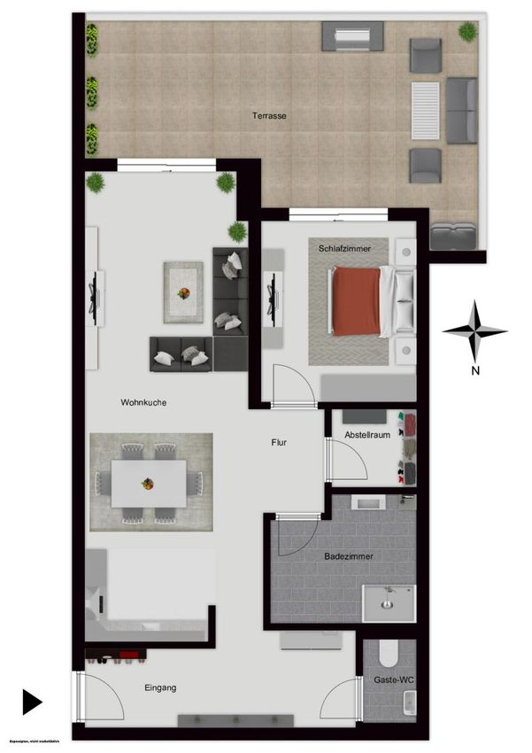 Das ruhig gelegene Schlafzimmer überzeugt mit einer angenehmen Größe und direktem Bezug zum Außenbereich. Ein modernes Badezimmer, ein separates Gäste-WC sowie ein praktischer Abstellraum sorgen für zusätzlichen Komfort und Stauraum im Alltag.