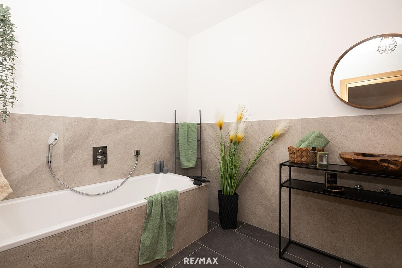 Das moderne Badezimmer ist hochwertig ausgestattet und wird durch ein separates WC ergänzt. Ein zusätzlicher Abstellraum sorgt für praktische Ordnung im Alltag.