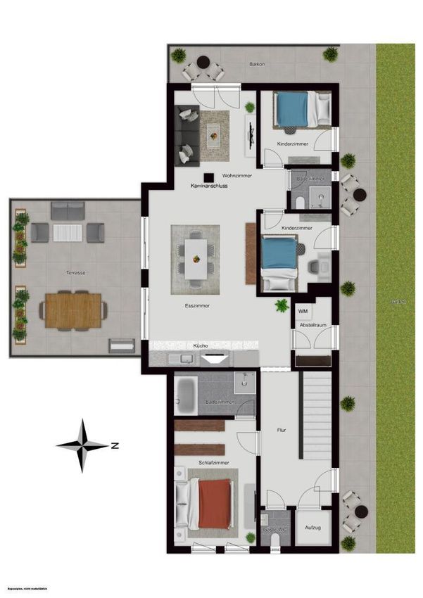 Der zentral gelegene Vorraum erschließt alle Bereiche der Wohnung und führt direkt in den weitläufigen Wohn-, Ess- und Küchenbereich, der durch seine Offenheit und großen Glasflächen beeindruckt. Ein vorhandener Kaminanschluss im Wohnbereich bietet die Möglichkeit, einen Kamin zu integrieren und sorgt für zusätzliche Wohnatmosphäre und Behaglichkeit. Von hier aus gelangen Sie auf die großzügige Terrasse, die zum Entspannen, Genießen und Verweilen einlädt – mit Weitblick und viel Sonne.